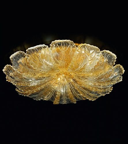 La plafoniera della serie BEMBO è realizzata in vetro Veneziano. La finitura è in metallo ed è disponibile nella variante: Bianco e Dorato lucido. Il vetro lo troviamo nei colori: Cristallo, Graniglia Ambra, Oro 24k e Rugiada di Cristallo. Della collezione BEMBO potete trovare, sempre sul nostro sito web, vari formati di grandezza e nella versione applique.